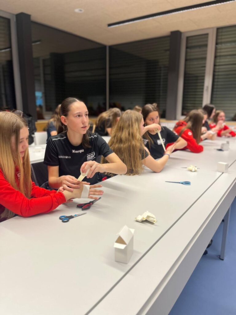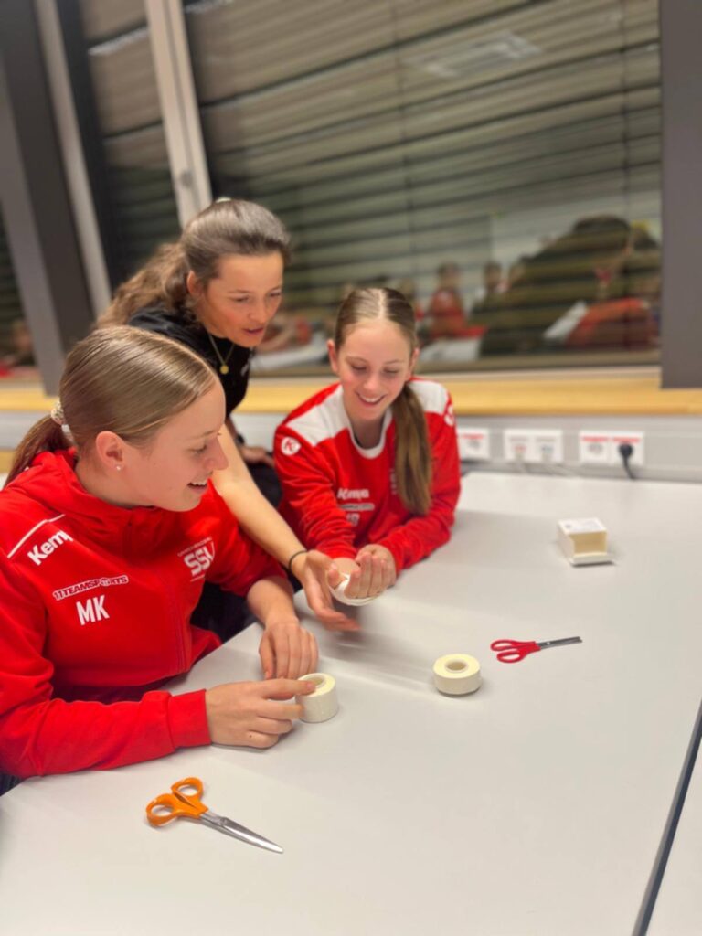 Unter der fachkundigen Anleitung von Vereins-Physiotherapeutin Kathi Auer erhielten die jungen Handballerinnen spannende Einblicke in die Grundlagen des Tapings – speziell abgestimmt auf die Anforderungen im Handball. Neben anschaulichem Hintergrundwissen stand vor allem die praktische Umsetzung im Mittelpunkt: In zahlreichen Übungen konnten die Spielerinnen selbst Hand anlegen, Techniken ausprobieren und sich gegenseitig tapen.